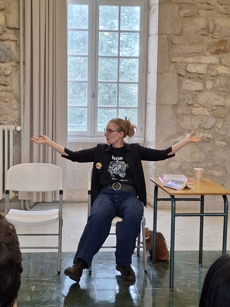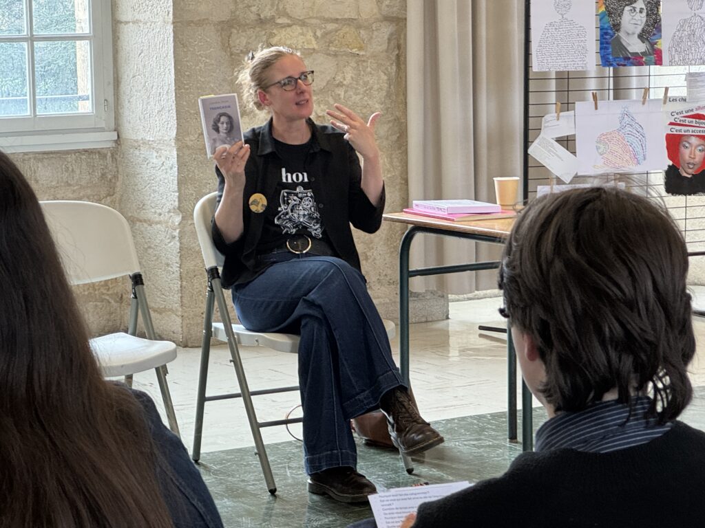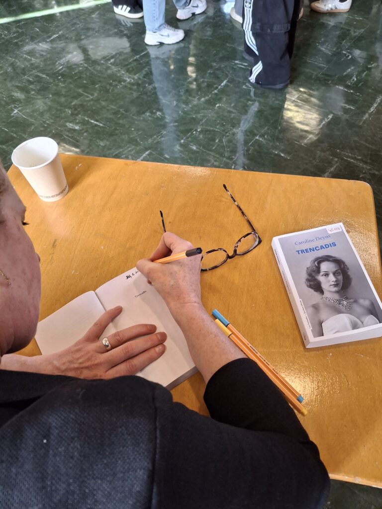 Réunis en salle Meyer vendredi 21 novembre, les élèves ont librement échangé avec l’autrice sur l’écriture de son roman dédié à la vie de l’artiste Niki de Saint Phalle. Intriguée par le décalage étonnant entre les couleurs joyeuses de ses célèbres sculptures les Nanas, et la personnalité sombre de cette femme, Caroline Deyns raconte comment elle a choisi d’explorer les grandes étapes de sa vie, de son enfance tâchée par l’inceste à l’abandon de ses enfants puis sa rencontre avec Jean Tinguely qui l’accompagnera sa vie entière d’artiste. « Trencadis » est le portrait d’une femme blessée à la créativité sans limite, un bel hommage au pouvoir réparateur de l’art.