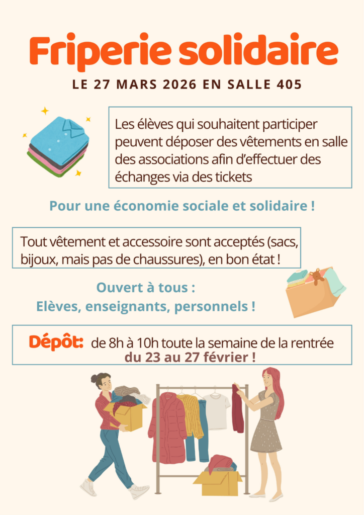 Dans le cadre de la semaine de l’économie sociale et solidaire qui aura lieu fin mars, les éco-délégués organisent une friperie solidaire le vendredi 27 mars.